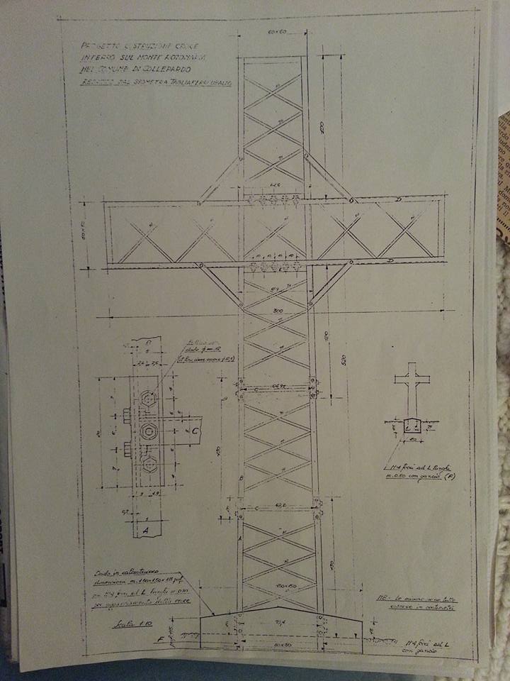 Anche a Collepardo si pensa di installarne una sul monte Rotonaria, la cui vetta appartiene al territorio comunale. Se ne fanno promotori il diciottenne Tommaso Tagliaferri, di Collepardo, e Deodato Tagliaferri (39 anni), abitante nella frazione Civita, unitamente al Parroco di Collepardo don Celestino Graziani ed al Priore della Certosa di Trisulti don Bernardino De Santis. L'8 agosto del 1900 due tronconi di legno di quercia vengono trasportati mediante buoi, con partenza da Civita. Una volta sulla vetta essi vengono uniti a formare la croce, che viene rinforzata con dei tiranti per contrastare la forza dei venti. Ciò nonostante, nel febbraio del 1951, logorata del tempo e dalle intemperie, quella prima croce di legno cade durante l’infuriare di una tempesta, in singolare coincidenza con la morte di Tommaso Tagliaferri (uno dei promotori), che avviene il giorno 28 di quello stesso mese. La croce in ferro (1956):Caduta la prima croce, subito si pensa ad installarne un'altra: tra coloro che organizzano l'impresa troviamo i discendenti degli antichi promotori: il geom. Ubaldo Tagliaferri (figlio di Tommaso) ed il Parroco don Filippo Frasca (Deodato Tagliaferri era il suo nonno materno). Essi sono affiancati da Erasmo Cristini, Serafino Cristini e Vincenzo De Sanctis. La materiale realizzazione della croce è affidata agli artigiani Nunzio De Sanctis e Antonio Sarandrea. Tutti i loro nomi, insieme con quello dell'allora Vescovo mons. Edoardo Facchini, sono immortalati in una lapide marmorea posta ai piedi della croce stessa.Il geom. Ubaldo Tagliaferri realizza il progetto (foto sotto) e ne chiede la necessaria autorizzazione al Comune di Collepardo. Viene anche organizzata una colletta per raccogliere i fondi necessari a coprire le spese. ![]() ![]()
