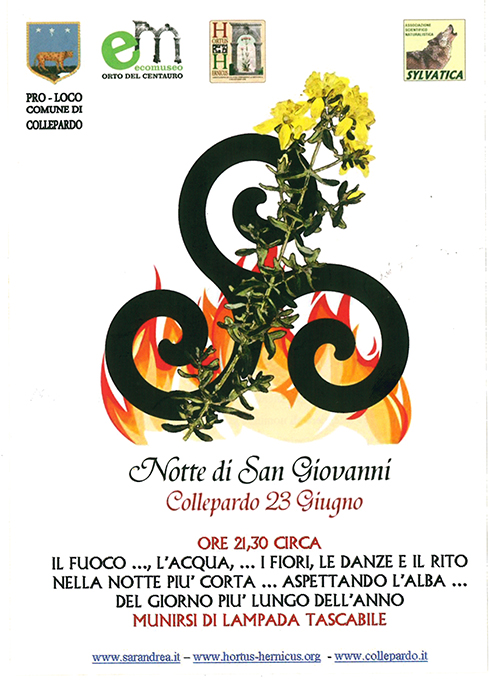 Nel corso dei secoli la nottata che precede questa ricorrenza ha conservato una sua propria ritualità, avente lo scopo di difendere gli uomini e le loro case da diavoli, malefìci e più in generale da ogni influsso negativo. A Collepardo questa antichissima tradizione non è mai scomparsa, grazie soprattutto a Mario Sarandrea e, successivamente, a suo figlio Marco (titolare dell'omonima liquoreria-erboristeria). D'altra parte Collepardo ha sempre avuto un legame molto forte con il culto di San Giovanni, basti pensare che la Chiesa parrocchiale, al centro del paese, venne fatta ricostruire intorno alla metà del XV secolo da Papa Martino V utilizzando elementi architettonici provenienti dalla Basilica romana di San Giovanni in Laterano. E, appena usciti dalla Chiesa, la caratteristica stradina che scende dalla Piazza è appunto dedicata a S. Giovanni (tra l'altro vi si può ammirare un bellissimo portale in pietra sormontato da un antico stemma del paese). Ogni anno, quindi, la manifestazione inizia la sera precedente e precisamente alle ore 21,30 del 23 giugno. ![]() Protagonisti dell'evento sono la pianta dell'Artemisia ed i fiori, in particolare l'Iperico, chiamato anche "Erba di San Giovanni" o "Scacciadiavoli". Come nell'antichità, questa serata è l'occasione per rivivere antiche atmosfere attraverso racconti, leggende, musiche e danze popolari, tutti in cerchio attorno ad un grande falò. Si assiste inoltre alla preparazione della "Guazza di San Giovanni" (acqua con infusione di fiori raccolti sul momento), con la quale avviene il tradizionale "Battesimo del Compare": ognuno, munito di un mazzo di fiori, "battezza" colui o colei che, da quel momento, diviene suo "Compare di San Giovanni". ![]() L'organizzazione della Festa è curata dall'Associazione "Hortus Hernicus", dall'Associazione "Sylvatica", dall'Associazione "Pro Loco" e dall'Ecomuseo "Orto del Centauro", con il patrocinio del Comune di Collepardo. Gli organizzatori consigliano ai partecipanti di munirsi, se possibile, di una lampada tascabile. -----